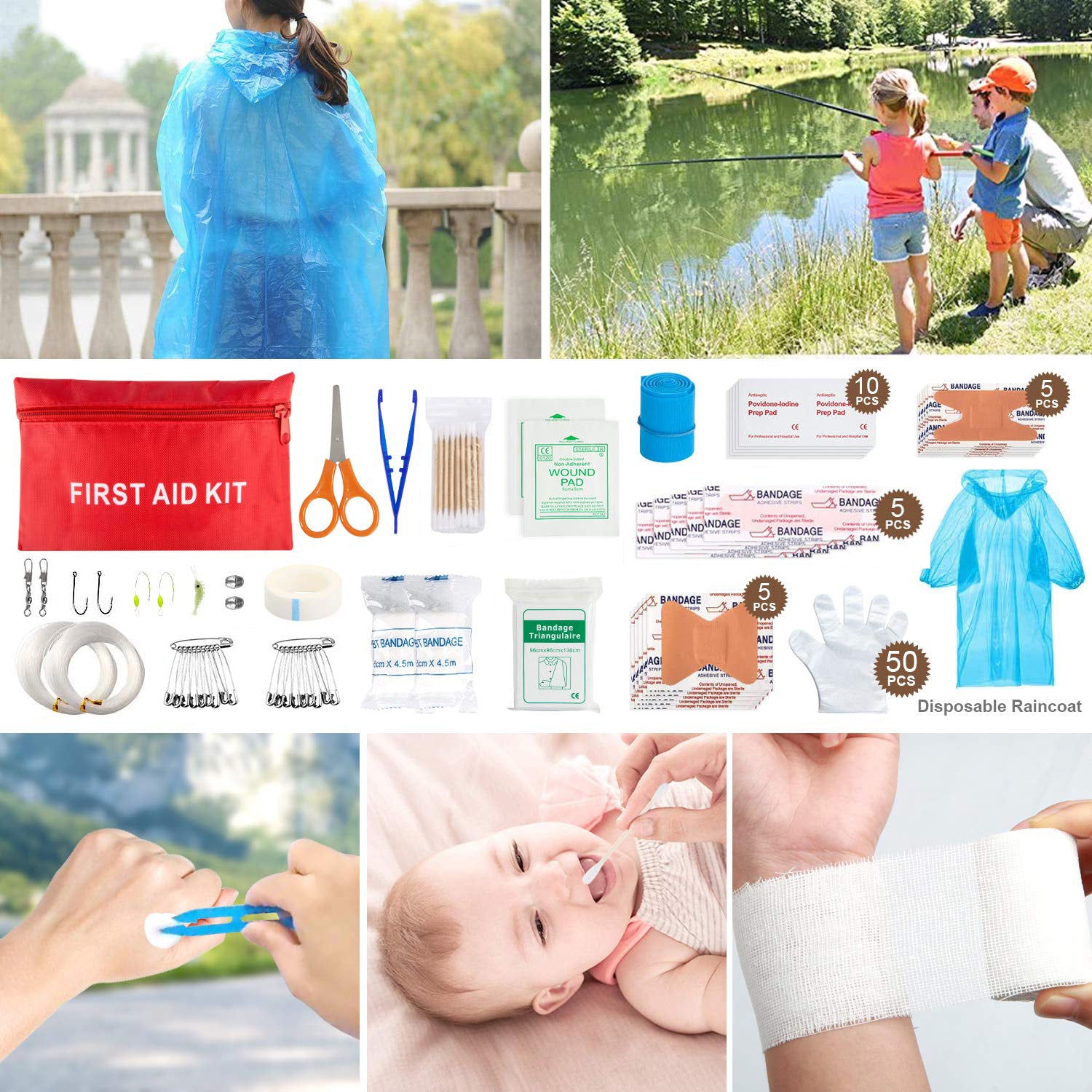 - [Basic First Aid Kit]: Comes with a first aid kit with bright red bag which includes essential items such as tweezers,bandages, would pad, bandage triangulaire, cotton buds etc. They can help stop the worsening of bleeding from minor injuries, mobilize injured limbs and even dress wounds to prevent infections.
