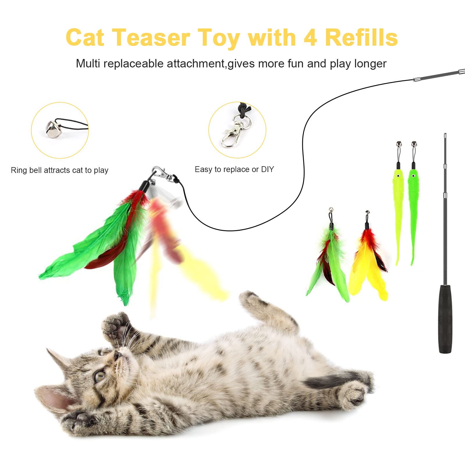 Engages Cat's Instinct,release their energy! Combine a popular cat toys such as feather toys,teaser wand and cat tunnel into one set,you can find out what your cat like or dislike. This Cat Toys Set is your best choices.Our cat toys provides a good interactive fun opportunity with your cat. You don't have to worry about your furniture getting scratched or your fur baby would lose interest in toys.
