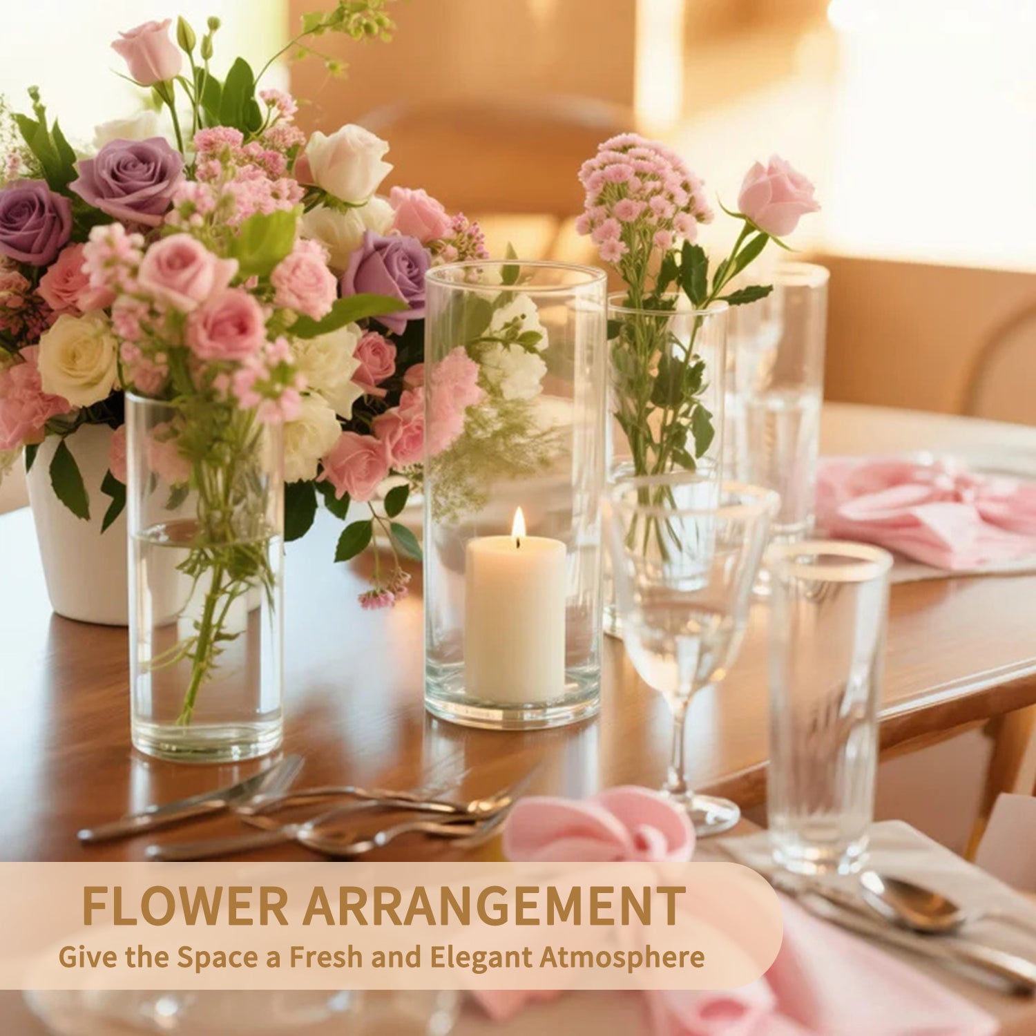 The cylindrical vase is the most minimalist and elegant glass floral container, serving as the perfect finishing touch for table decorations. Its graceful, flowing silhouette makes this glass cylinder vase the most visually striking floral arrangement vessel, suitable for virtually any decorative occasion. Available in multiple sizes to meet diverse needs, it adds a distinctive flair to any space—whether for parties, weddings, or event setups.