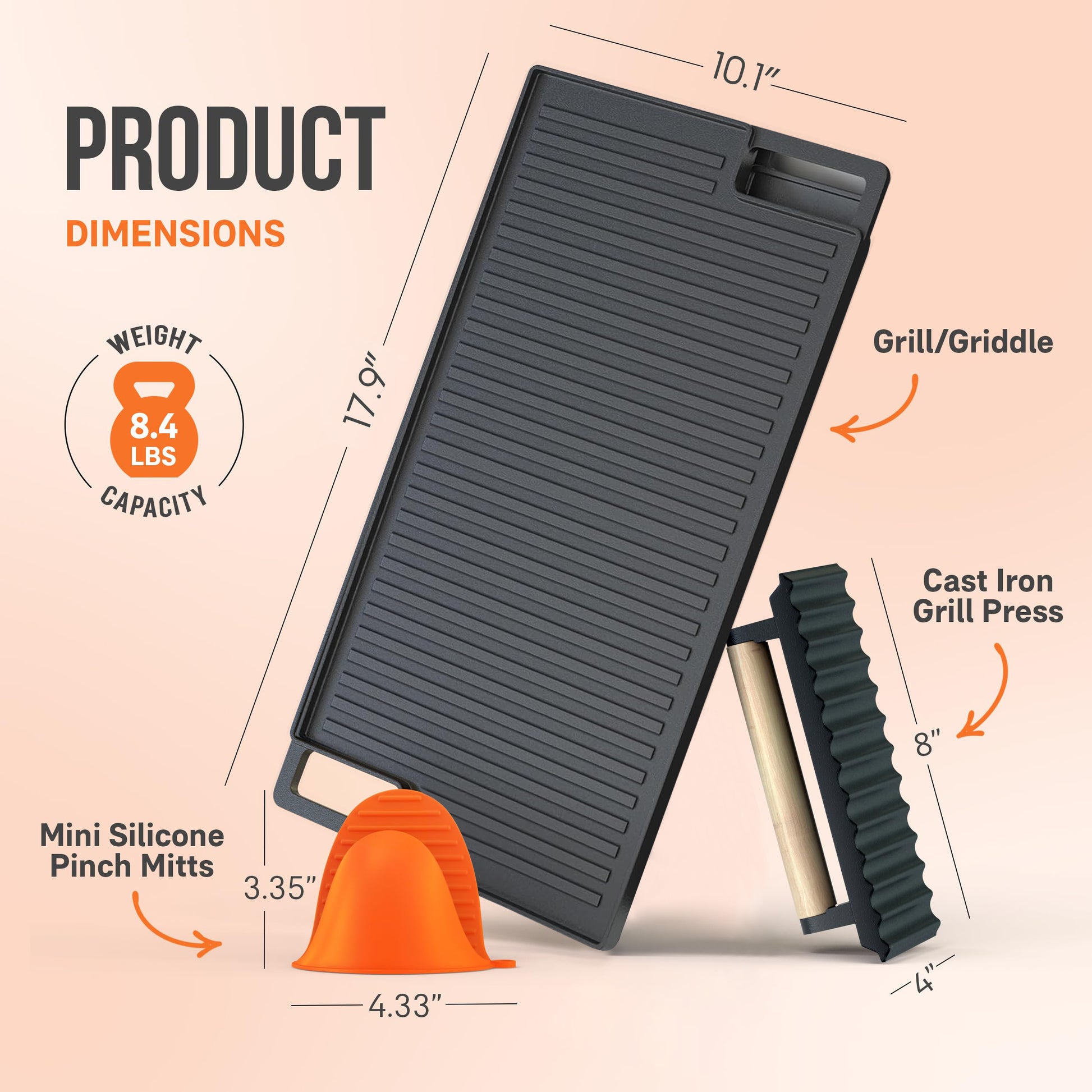 Cast Iron Griddle, Reversible Grill/Griddle + Cast Iron Press + Pinch Mitts, Grill Pan For Stove Top, Gas Grill, Indoor & Outdoor Cooking - Pre Seasoned & Non-stick (10.1" x 17.9")