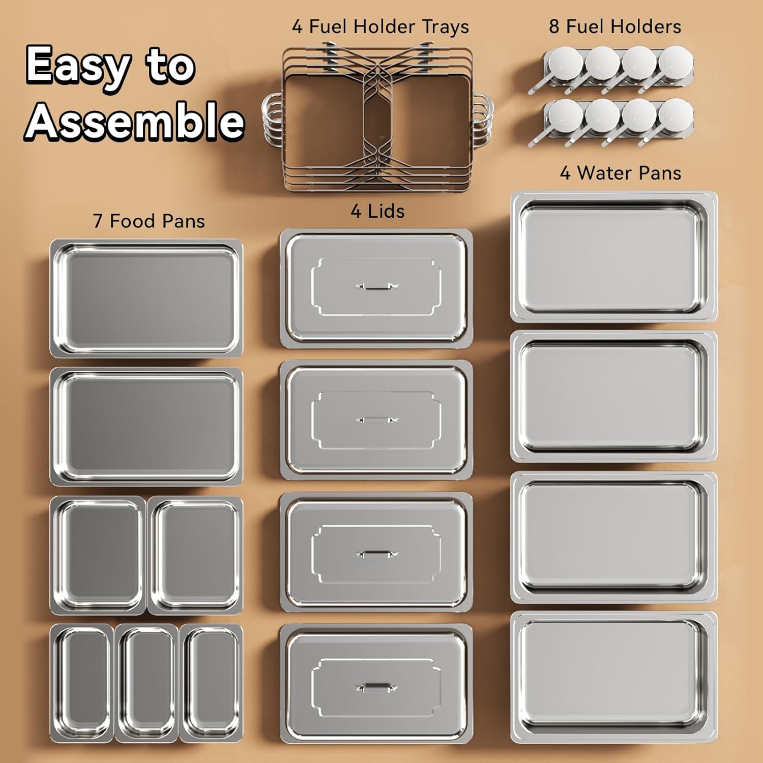 - AVOID HURTING YOUR FINGERS: This food warmers for parties have rolled-edge design that will protect your fingers. This safety design can prevent worrying about handling or cleaning the chafing dish with caution. You just need screws for the lid, while the rest of the parts require no additional hardware. Simply unfold the stand, stack the pans, and you’re good to go in just 2 minutes! And when it comes to cleaning up, just wash then in tap and wap dry will work.