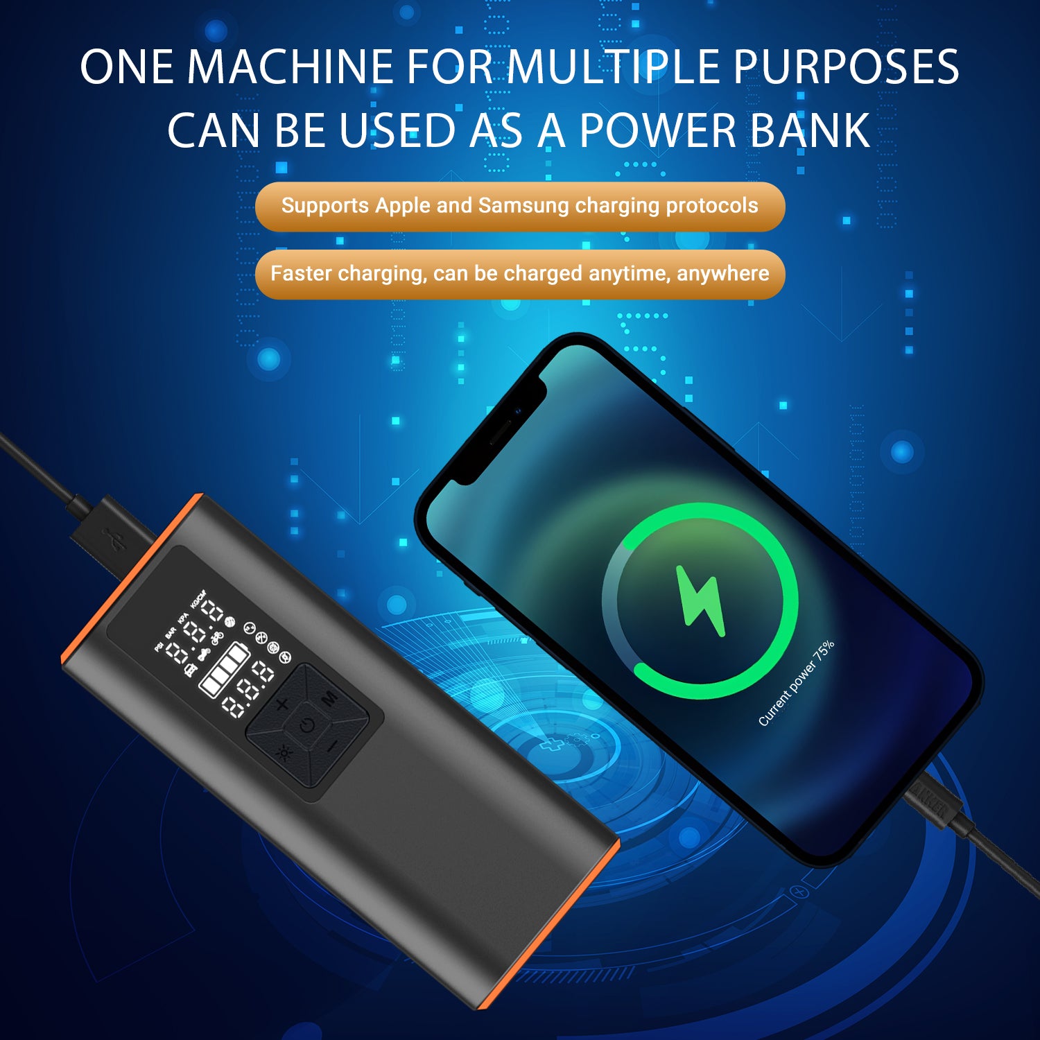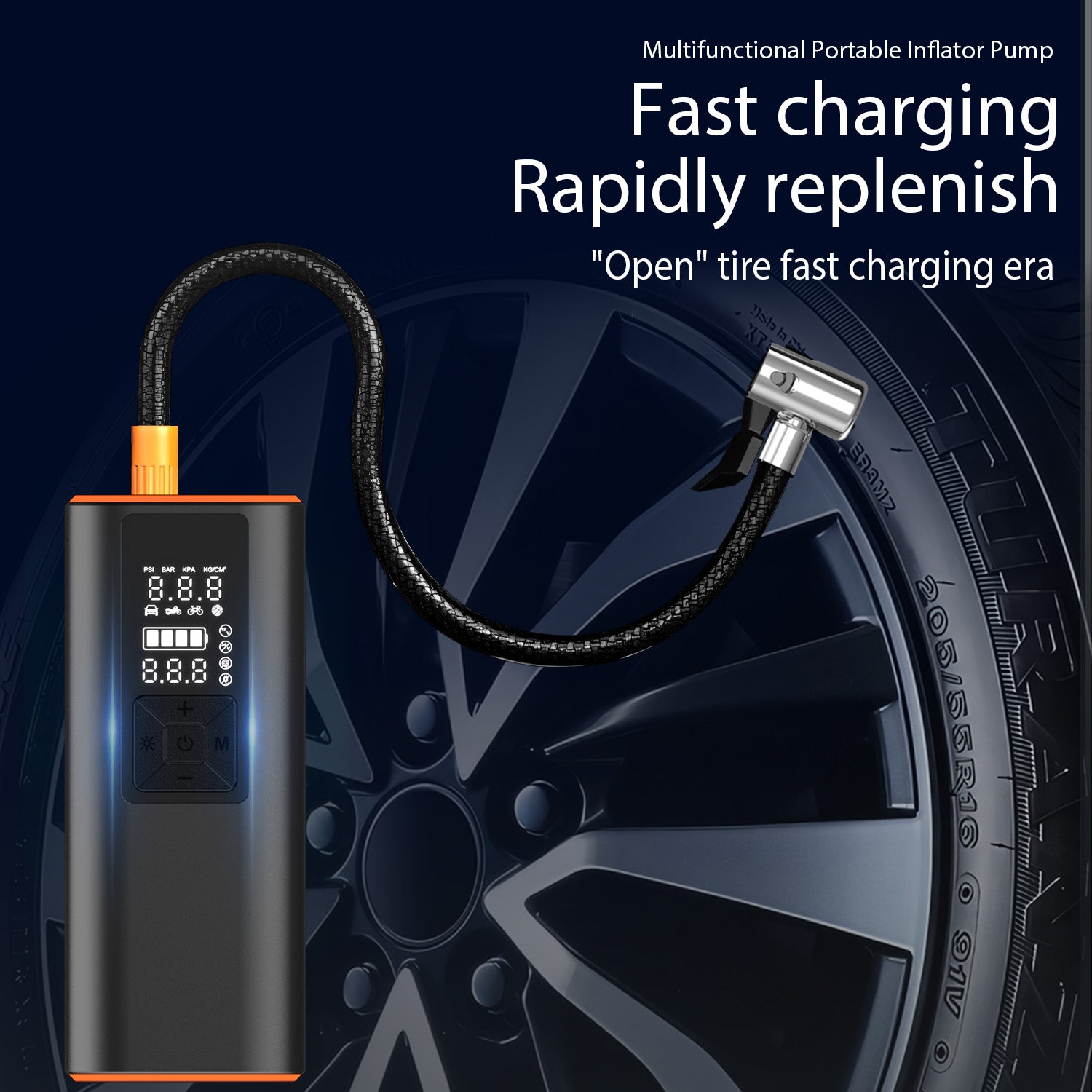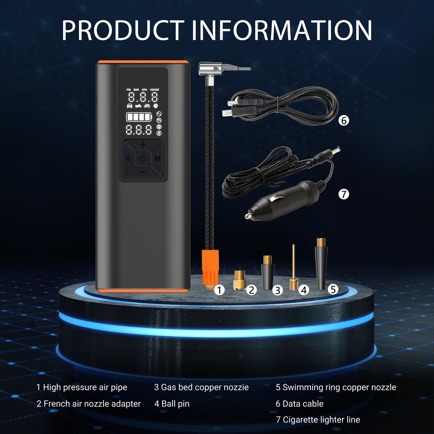 KEY HIGHLIGHTS: Easily switch between PSI, kPa, BAR and KG/CM pressure units at the touch of a button; Large, easy-to-read LCD display; Digital tire pressure gauge; Built-in LED flashlight for low-light conditions; Deflate button for lowering pressure; Air hose stores inside; Powerful 6000 mAh rechargeable battery for fast charging; Rated for 150 PSI. NOTE: Battery performance depends on many factors: - Tire size and type: Inflating larger or high pressure tires will drain the battery faster. - Temperature: Cold weather will reduce battery efficiency. - Proper charging: For optimal battery performance, it is recommended to fully charge the pump before each use.
