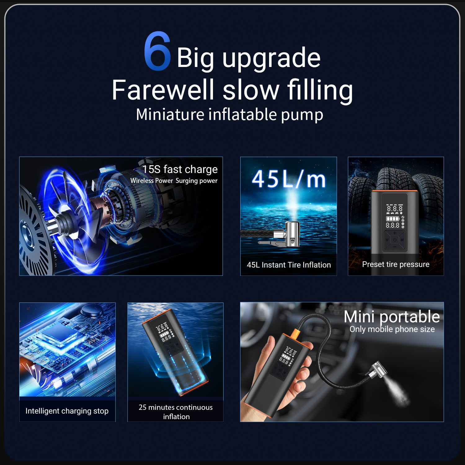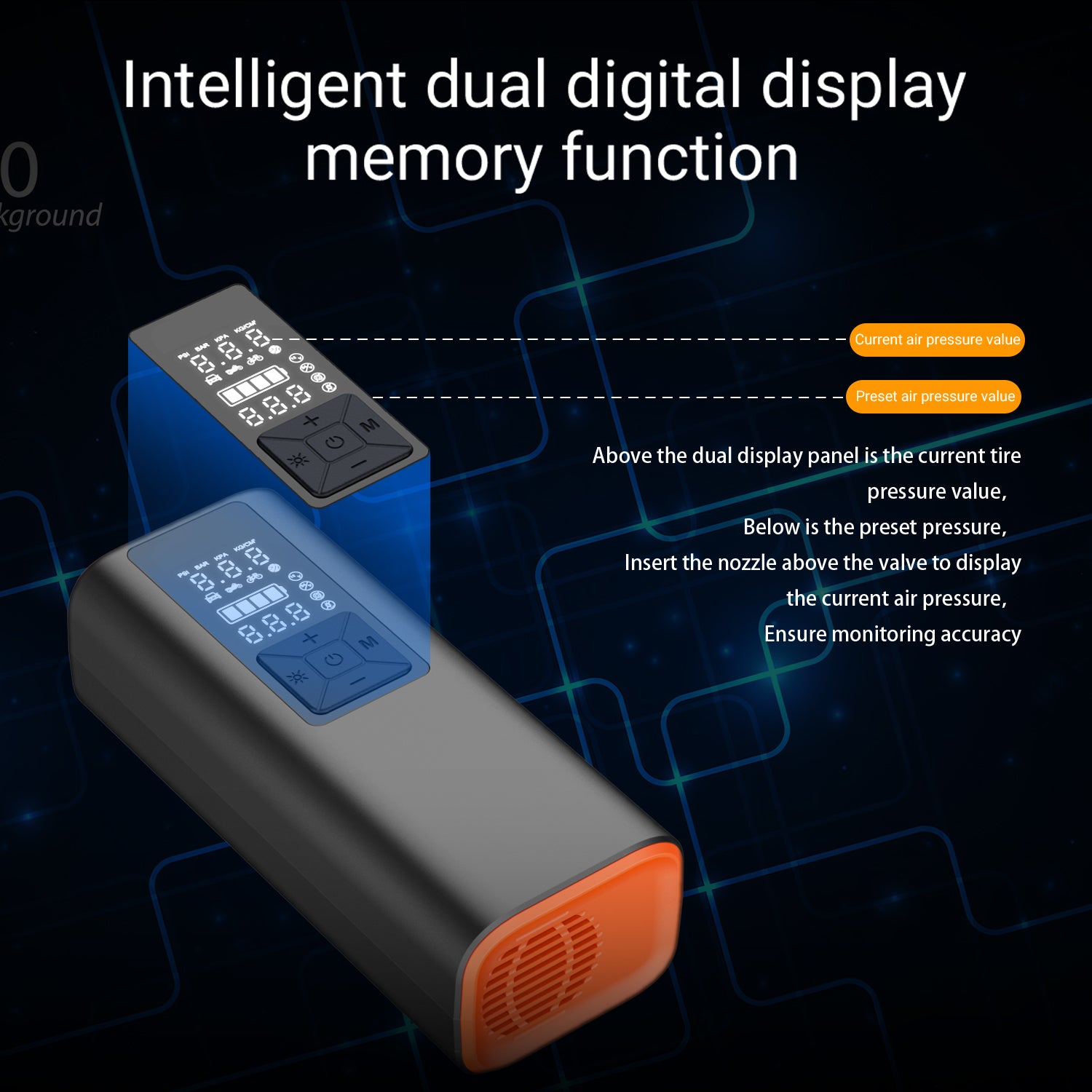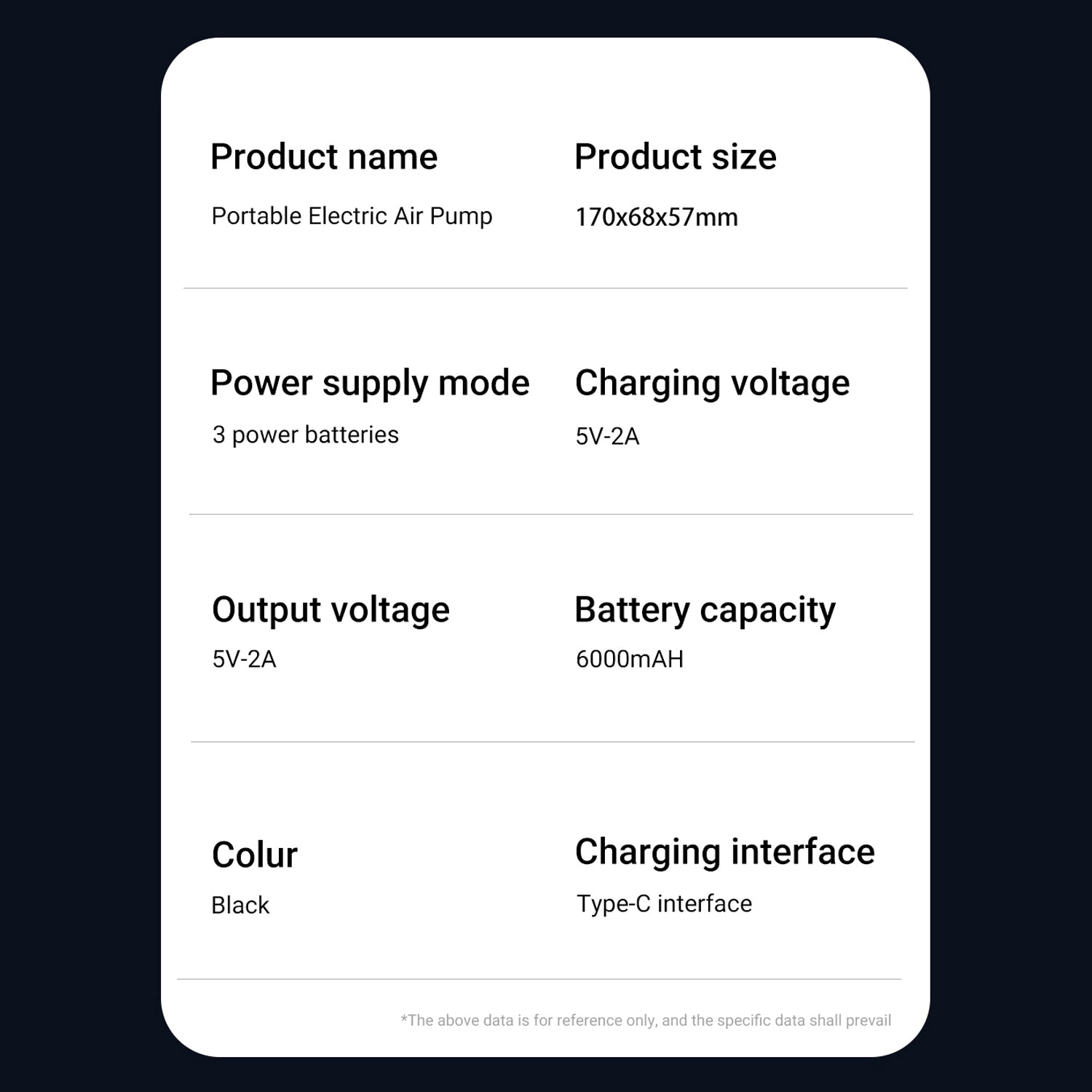 KEY HIGHLIGHTS: Easily switch between PSI, kPa, BAR and KG/CM pressure units at the touch of a button; Large, easy-to-read LCD display; Digital tire pressure gauge; Built-in LED flashlight for low-light conditions; Deflate button for lowering pressure; Air hose stores inside; Powerful 6000 mAh rechargeable battery for fast charging; Rated for 150 PSI. NOTE: Battery performance depends on many factors: - Tire size and type: Inflating larger or high pressure tires will drain the battery faster. - Temperature: Cold weather will reduce battery efficiency. - Proper charging: For optimal battery performance, it is recommended to fully charge the pump before each use.