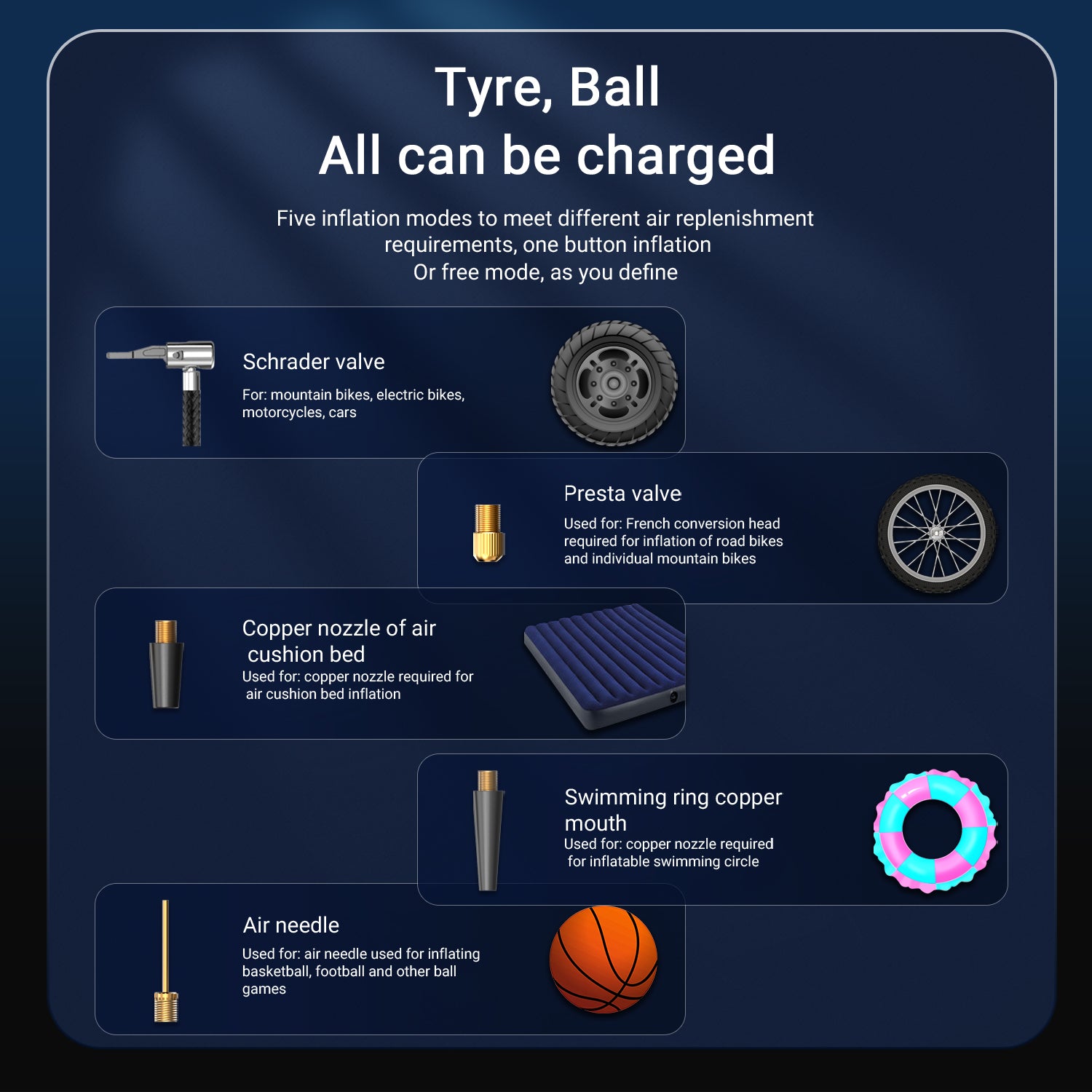 - Inflate Anything: Includes 3 attachments and air hose. Use Schrader valve on cars, SUVs, motorcycles, and bicycles. Use Presta valve for bicycle tire pumps. Needle adapter for sports equipment like basketballs. Universal adapter for cushions, air pillows, and more. NOTE: The Kaqinu is not suitable for heavy uses that require a small air compressor, such as air beds, paddle boards, or heavy tires.