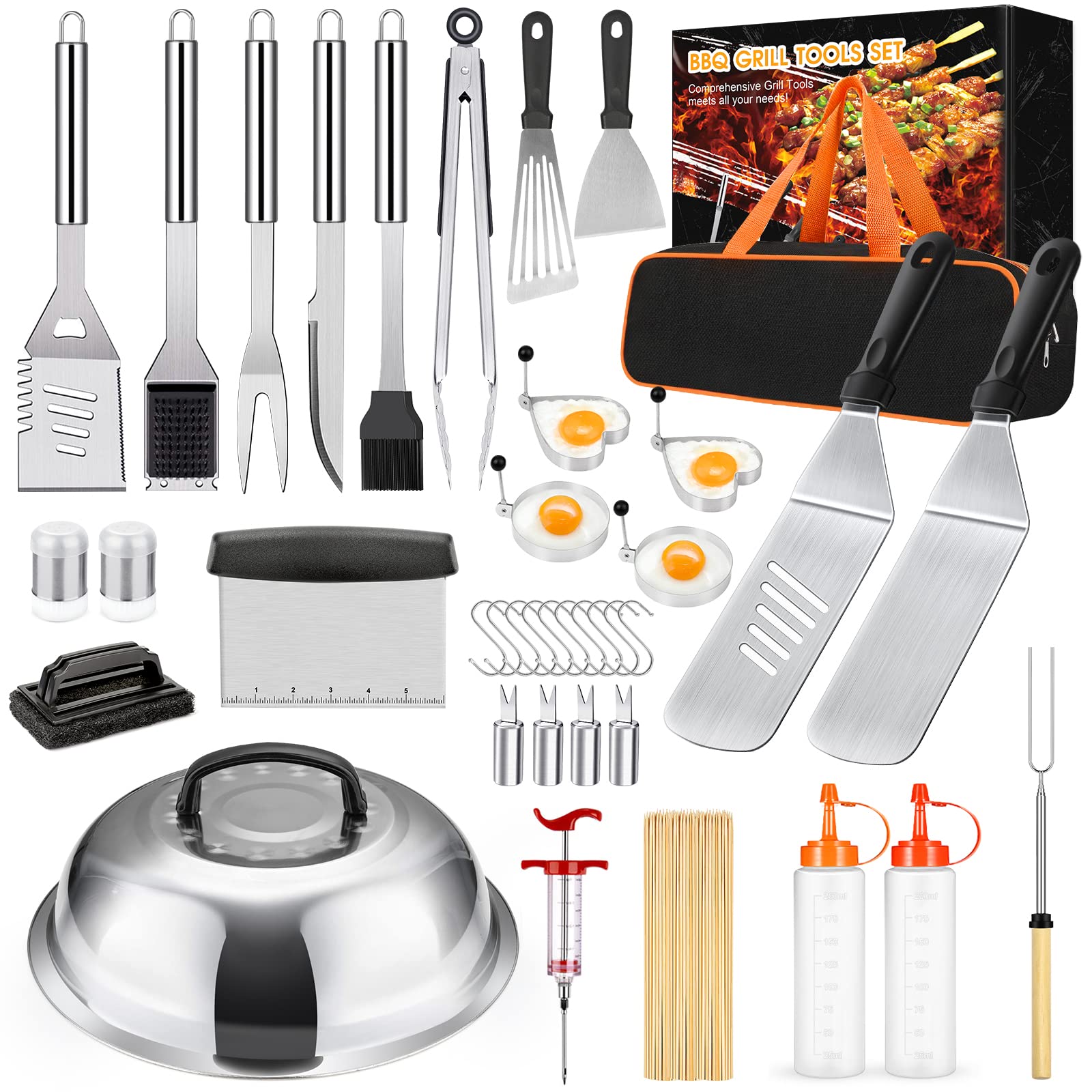 Our griddle accessories are ideal for blackstone flat top griddle for camping. It meets all needs in grilling,which includes 1 Grill Tongs,1 Grill Spatula,1 Slotted Spatula,1 Griddle Chopper,1 Blade Scraper,1 Gill Knife,1 Extendable Roast Fork,1 Meat Injector,1 Barbecue Fork,1 Basting Brush ,2 Cleaning Brush,100 Bamboo Skewer,4 Egg Rings,4 Corn Holders ,1 Basting Cover,2 Spice Shaker,8 Hanging Hooks,2 Squeeze Bottle,1 Carry Bag.