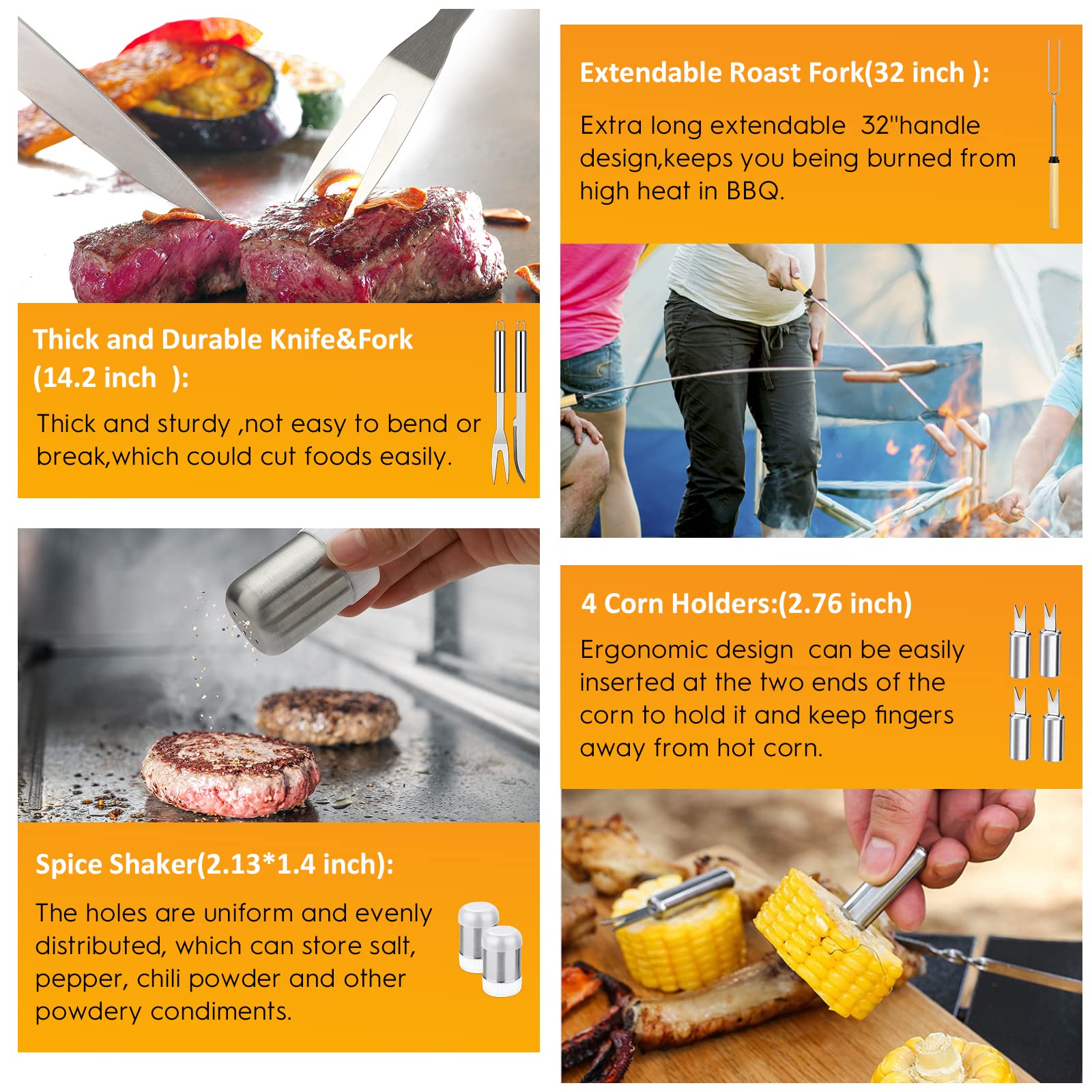 This kit has various useful and practical tools that you need in BBQ.Long enough handle design for handling large sized grills,keeping your hands from burning by the flame or hot surface.Except the necessity like normal grill tools,we also add some flat top griddle accessories,like Spatula,Slotted Turner,Blade Scraper,Basting Cover,etc.Besides this,it also includes some practical tools like fork, knife, silicone basting brush, grill tongs for handling your cooking easily.