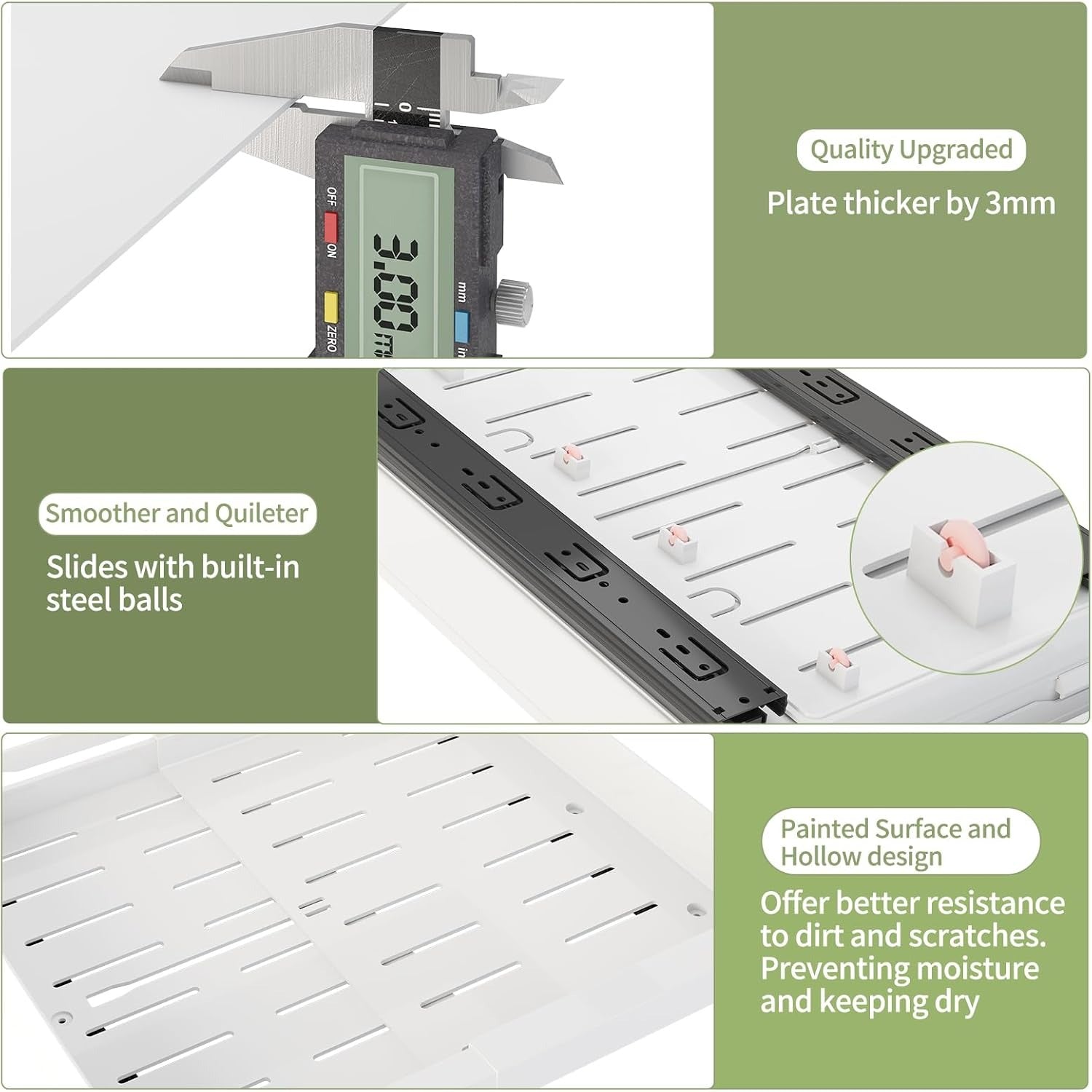 - Smooth Sliding: Our cabinet organizer features guide rails, which rigorously tested to withstand 40,000 open and close cycles. The pull-out cabinet shelf extends fully, allowing easy access and ensuring smooth, quiet operation.