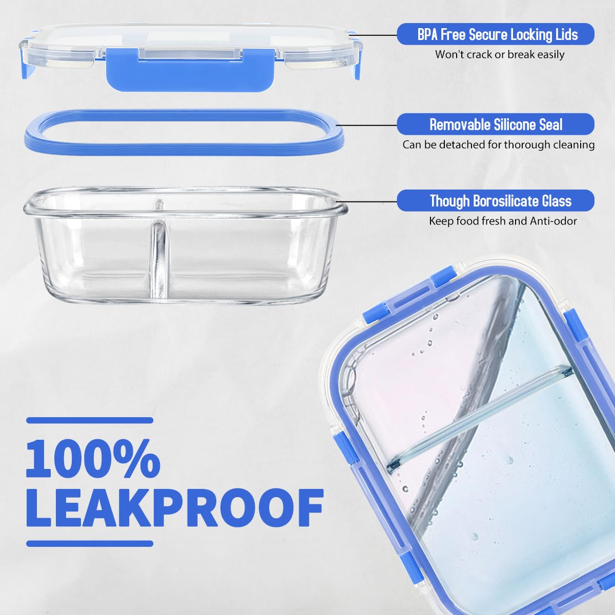 42pcs Glass Food Storage Containers with Lids Set, 21 Containers & 21 Lids Include One 2 Compartments Glass Meal Prep Containers with Snap Locking Lids, Leak Proof Lunch Containers BPA-Free,Blue