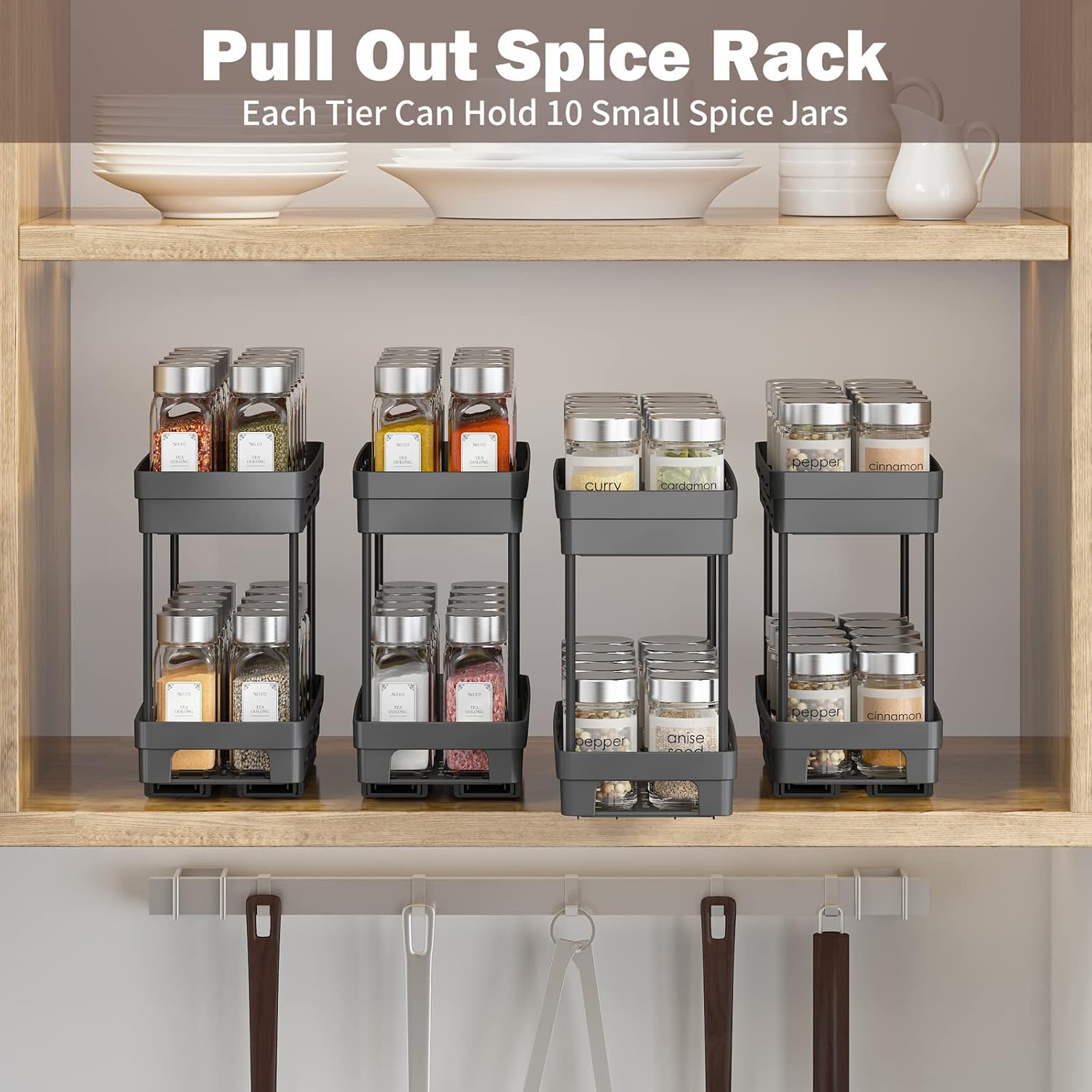 - [Perfect Cabinet Spice Organizer Solution] - 3 pcs pull out spice rack organizer for cabinet is the perfect solution to organize your cabinet. Slide out spice rack organizers size 4.33''W x 10.40''D x 8.50''H(cabinet needs at least 12'' high), which are great for utilizing tight spaces & narrow cabinets. As a must-have for spice storage, they can hold the various size & different shapes of spices. Pull out the spcie rack, find the seasoning you want. Each tier can hold 10 small spice jars.