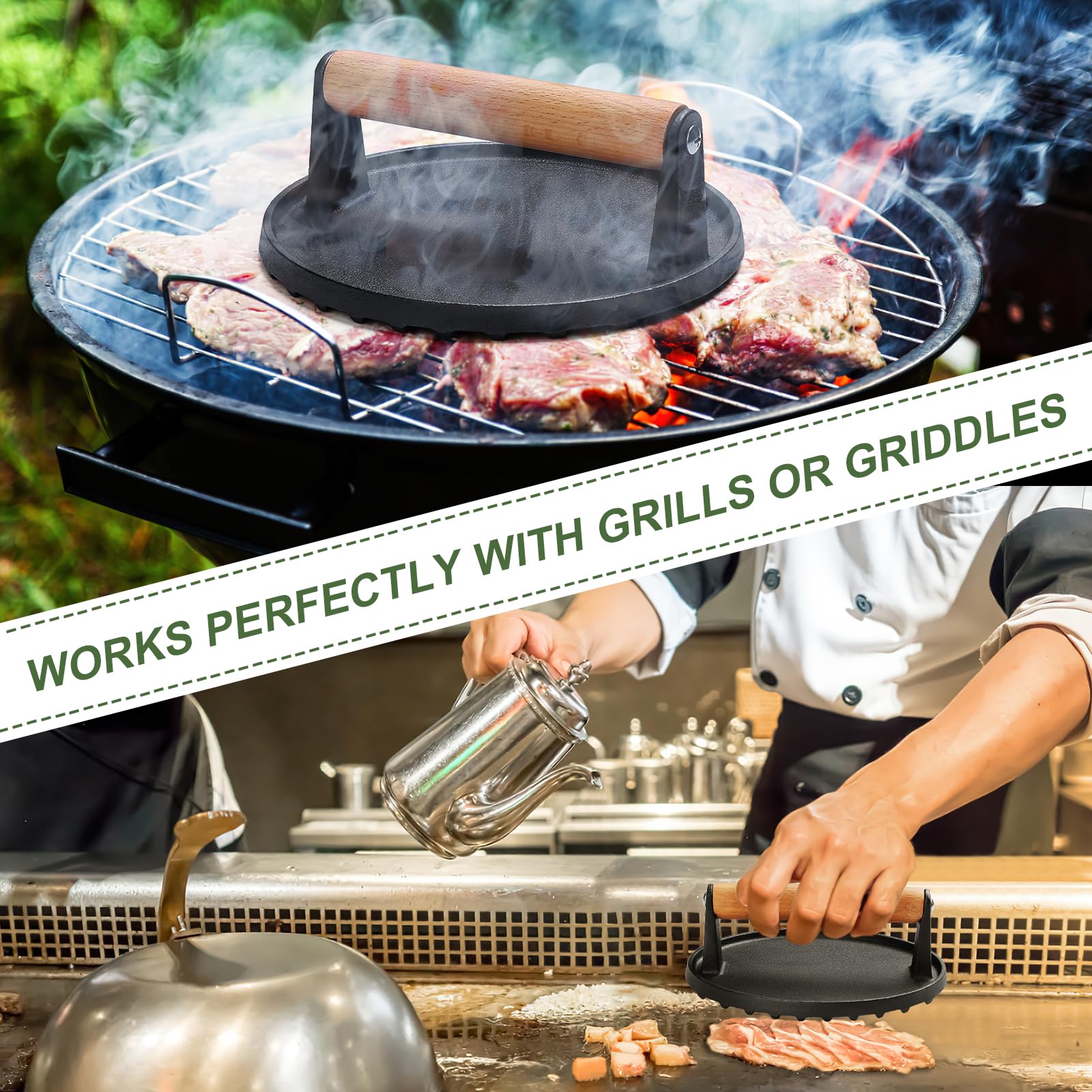 - 【PROFESSIONAL TEXTURED DESIGN GROOVED BOTTOM】: Our kitchen grill press is designed to give your meats and sandwiches restaurant quality grill marks, keeps the press positioned, and prevents bacon from curling, ensuring it looks as good as it tastes!