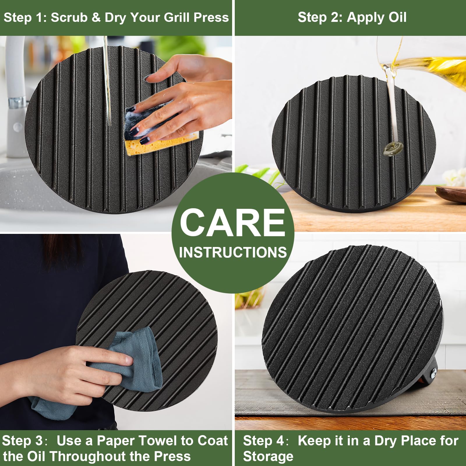 【HEAVY-DUTY CAST IRON GRILL PRESS】:Our barbeque grill press is made of heavy duty food grade cast iron. Use the grill weight to press out unwanted grease and fat, safe to use in the oven, on the stove, on the grill, griddle, or campfire. The press can also be seasoned like cast-iron skillets to create a non-stick surface.