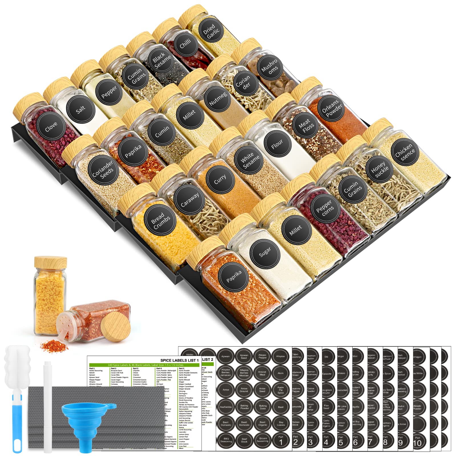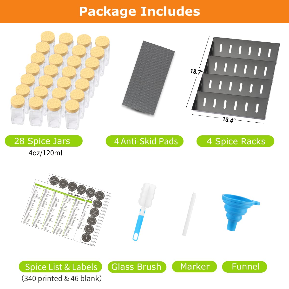 Complete Spice Drawer Organizer, Including:4 tier tray spice racks,4 Rubber anti-skid pads,28 (empty) spice jars,28 shaker lids,spice catalog, 486 spice labels,1 erasable marker pen,1 funnel,1 cup brush.Our drawer spice rack organizer set always knows your requirement and easily frees up more space for you, no more clutter in your kitchen cabinet, drawer, cupboard.