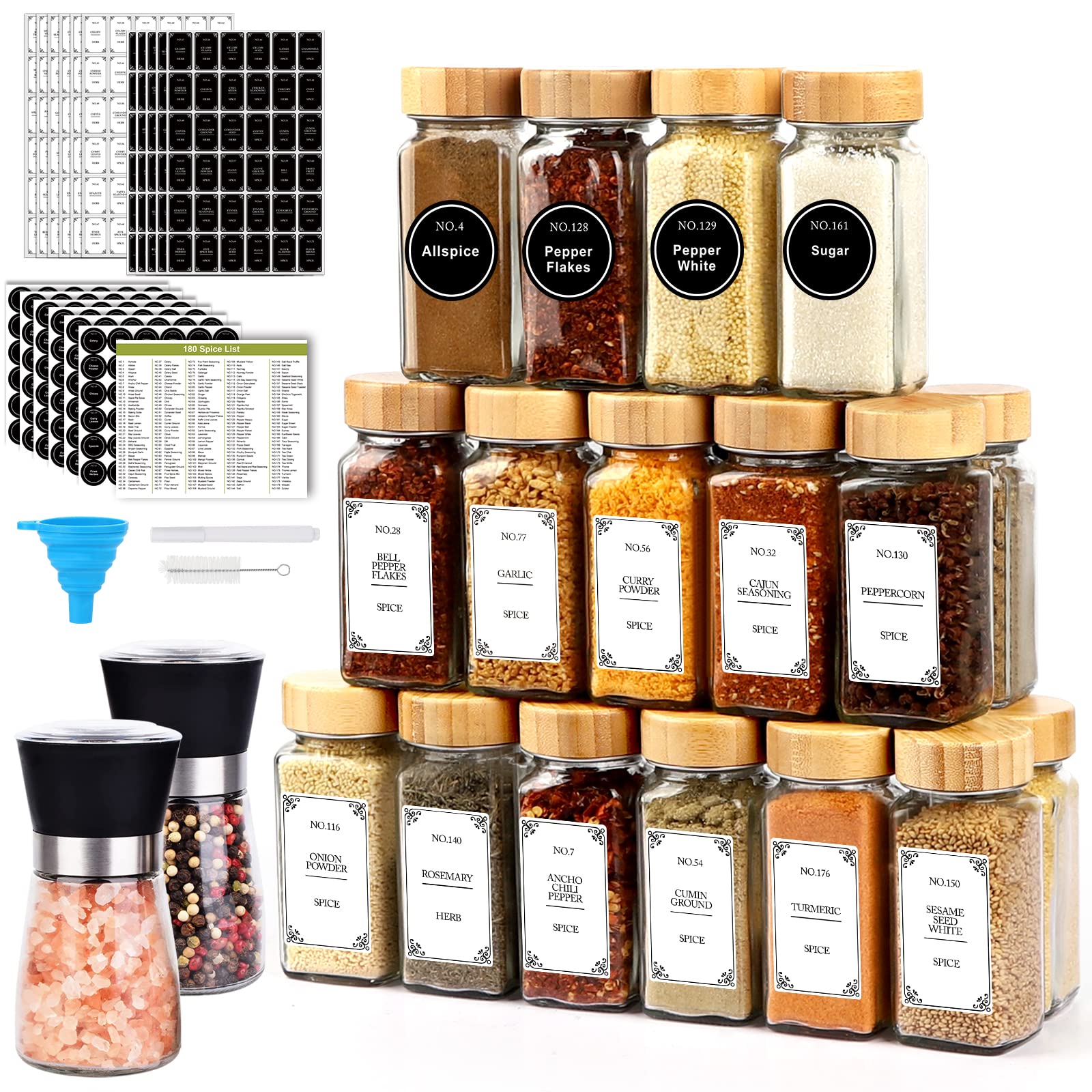 • 24 pcs 4oz glass spice jars with bamboo lids,24 shaker lid,648 PCS waterproof elegant reusable stickers,1 spice list, 2 Salt and Pepper Grinder,1 silicone collapsible funnel, 1 chalk and 1 tube brush. Making your kitchen look organized and tidy,beautiful bamboo lids and stylish square bottle design,no more clutter of your seasonings!
