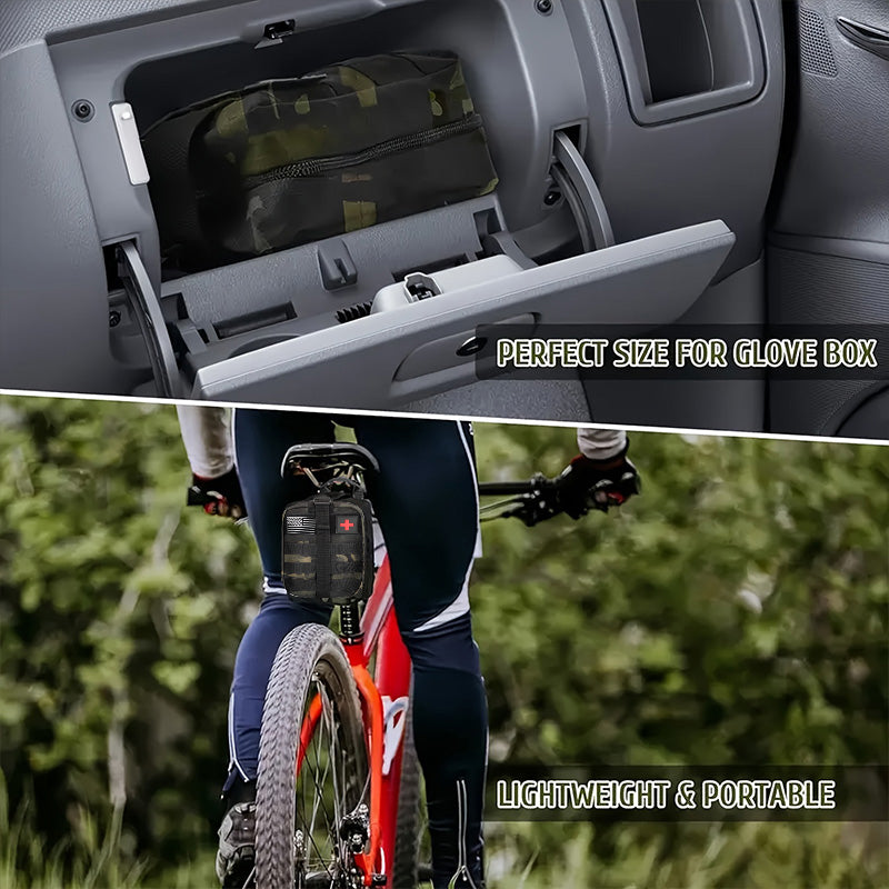 - [Portable Molle System Compatible Bag] The upgraded emt bag was made of military grade water-resistant 1000D nylon with a size of 8” x 5.9” x 4.3''. You can attach it to other molle compatible backpack or combat vest or belt by using its back attachment straps or removal velcro panel. Great gift idea for men women or people who loves hiking, hunting, camping, car travel, wilderness adventure. Easy to carry, small and lightweight, can hold all the 180pcs emergency supplies and survival tools.